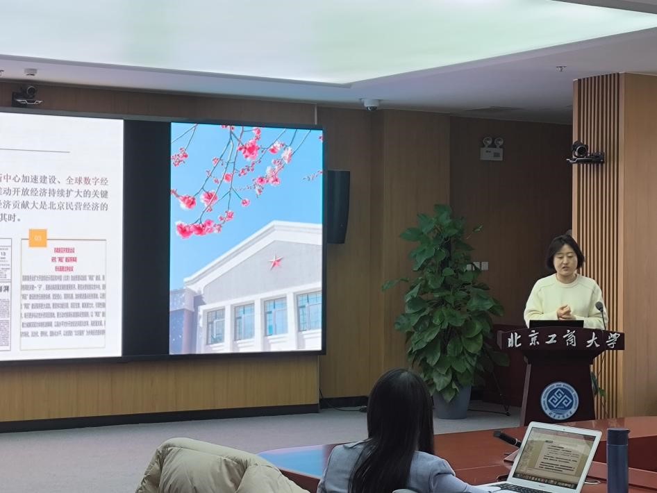 年度一般项目“北京促进民营经济健康发展、高质量发展研究”负责人贾君怡教授从企业、产业和生态三个维度出发,对大数据背景下北京市民营经济的发展成效与存在的问题、多案例的民营经济高质量发展模式与经验,以及协同的实现路径与政策规划等核心内容进行了汇报。