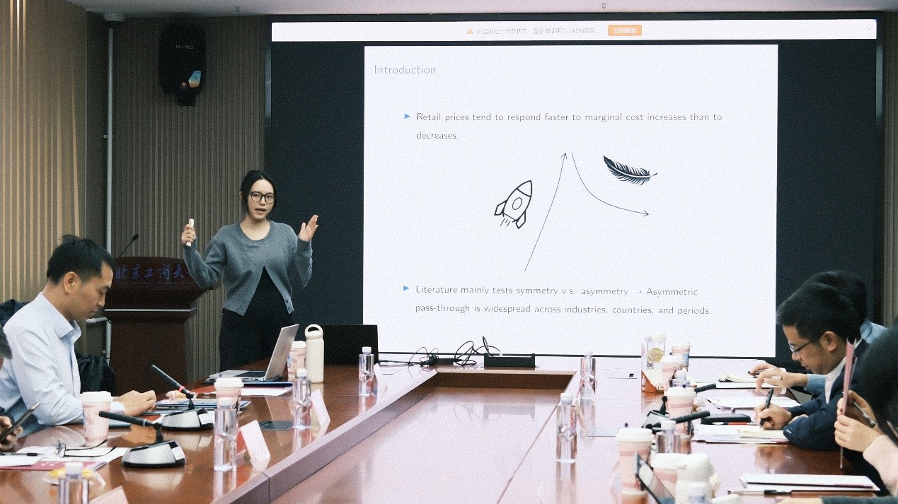 人民大学吕媛老师报告了论文“Asymmetric Pass-Through and Competition”,该文以希腊2010年三次消费税上升和2012年一次消费税下调为外生成本冲击,选取37个具有独立市场特征的希腊岛屿为研究场景,通过双重差分法等方法,探究零售汽油市场的非对称价格传导现象及竞争的影响。结果发现:零售价格对消费税上升的传导更快,对消费税下调的传导更慢;竞争加剧了税收上升时的价格传递,但对税收下降时的传递没有影响;消费者搜索行为是这一现象的关键驱动机制,而非共谋。王爱萍老师进行了点评,她建议系统地将结果与现有理论进行对话,说明本文在何种程度上推进了搜索成本这一理论机制的解释,并明确竞争的度量。