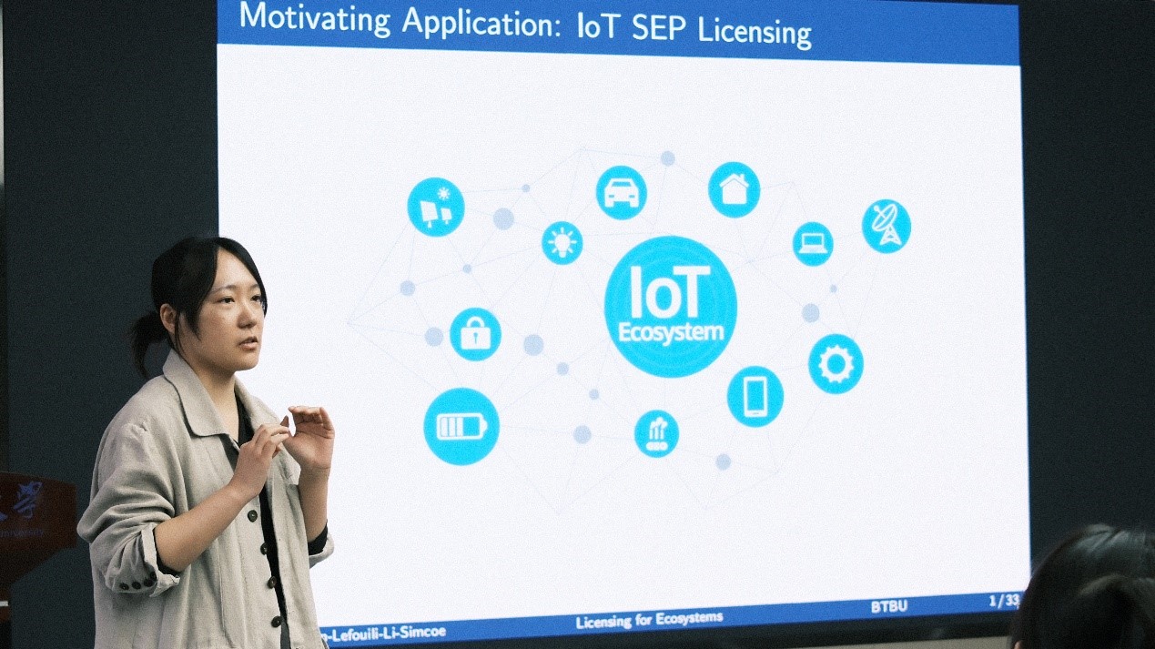 人民大学栗雅欣老师报告了论文“Licensing for Ecosystems”,研究围绕生态系统专利许可定价展开,以华为向日本中小企业收专利费、高通跨领域布局等作为案例,指出当一项专利涉及多个互补产品时,垄断性的生态系统定价可能比零定价带来更高的社会福利。当存在多个互补平台时,会导致“专利费堆叠”,但这可能反常地降低某些设备的总价格。张凡老师进行了点评,他建议进一步研究专利定价策略对厂商创新策略的驱动作用,以及该创新策略进而推动厂商生态网络发展并影响市场的反向趋势。