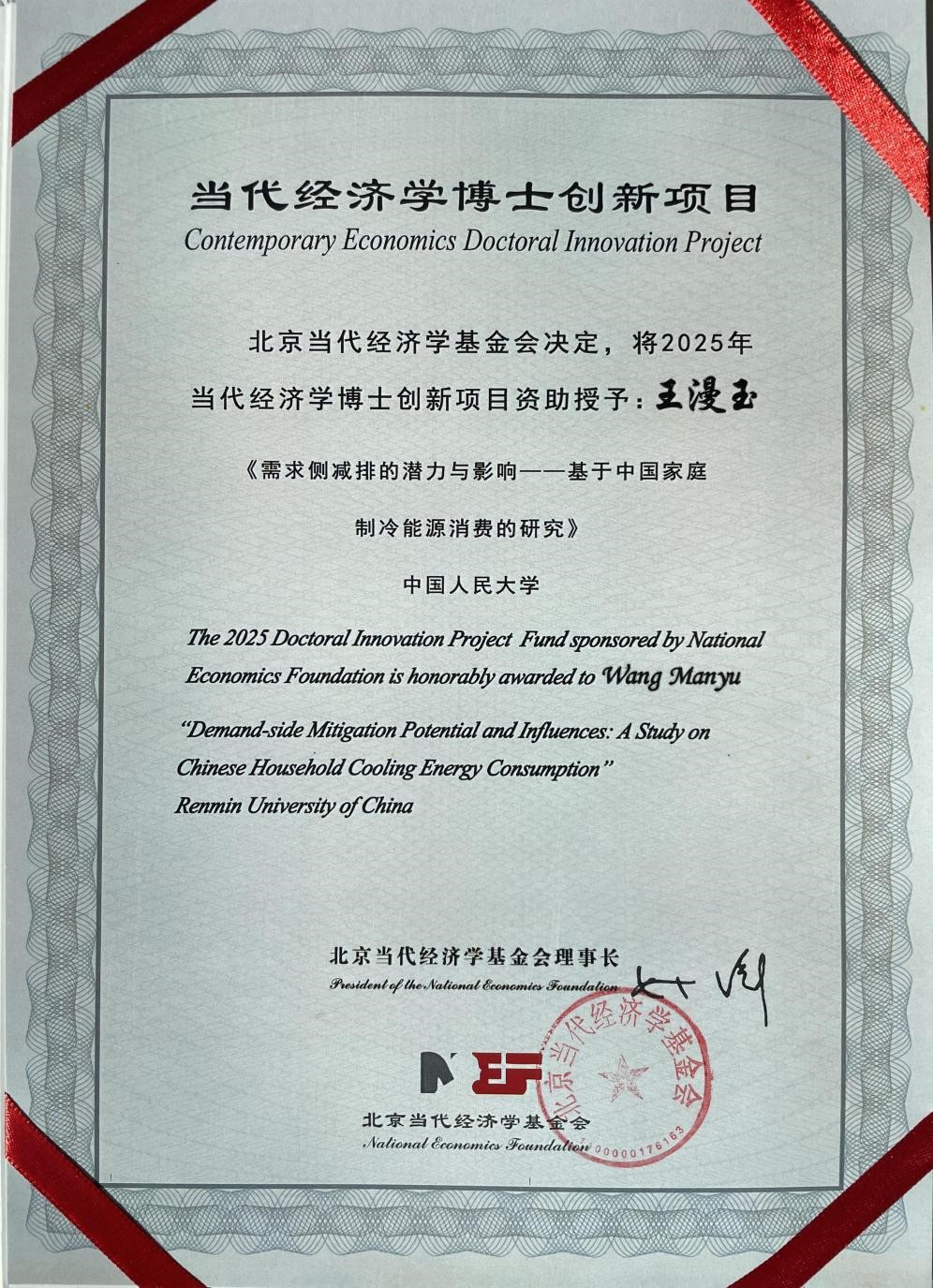 11月15-16日,由当代经济学基金会、西南财经大学主办的2025年当代经济学博士创新项目证书授予仪式暨2025年中国青年经济学家论坛在西南财经大学柳林校区隆重举行,会上揭晓了2025年当代经济学博士创新项目结果。经过现场答辩和评委打分,公司2025年新入职教师王漫玉老师的博士论文《需求侧减排的潜力与影响——基于中国家庭制冷能源消费的研究》成功入选。这是当代经济学基金会自2016年设立博士创新项目以来,公司青年教师首次获此殊荣。