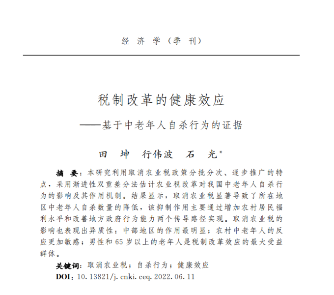 近日,yl23455永利青年教师田坤博士于国内权威学术期刊《经济学(季刊)》发表论文《税制改革的健康效应——基于中老年人自杀行为的证据》。