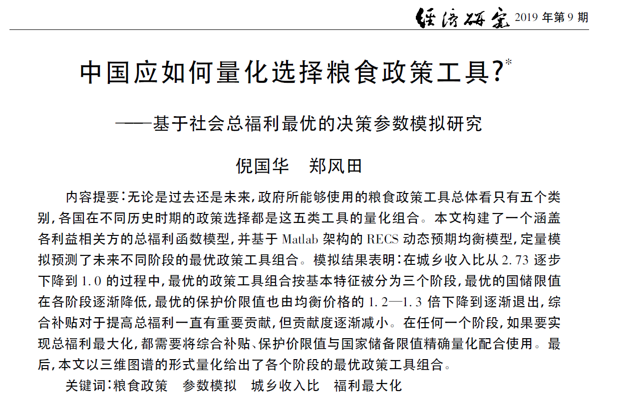 倪国华教授的该篇研究成果发表于中文经济学顶刊《经济研究》2019年第9期。该文构建了一个涵盖各利益相关方的总福利函数模型,并基于Matlab架构的RECS动态预期均衡模型,定量模拟预测了未来不同阶段的最优政策工具组合。模拟结果表明:在城乡收入比从2.73逐步下降到1.0的过程中,最优的政策工具组合按基本特征被分为三个阶段,最优的国储限值在各阶段逐渐降低,最优的保护价限值也由均衡价格的1.2—1.3倍下降到逐渐退出,综合补贴对于提高总福利一直有重要贡献,但贡献度逐渐减小。在任何一个阶段,如果要实现总福利最大化,都需要将综合补贴、保护价限值与国家储备限值精确量化配合使用。最后,该文还以三维图谱的形式,量化给出了各个阶段的最优政策工具组合。