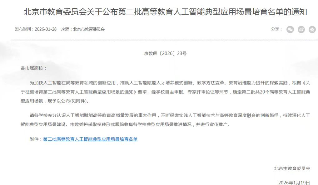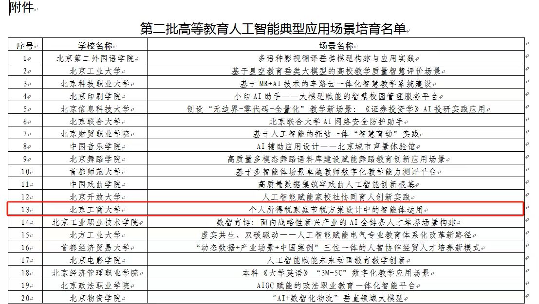 近日,北京市教育委员会发布《关于公布第二批高等教育人工智能典型应用场景培育名单的通知》(京教函〔2026〕23号),公司yl23455永利杨琼老师申报并负责建设的《个人所得税家庭节税方案设计》项目成功入选,成为北京市20个高等教育人工智能典型应用场景培育项目之一,也是公司本次唯一有幸入选的项目。