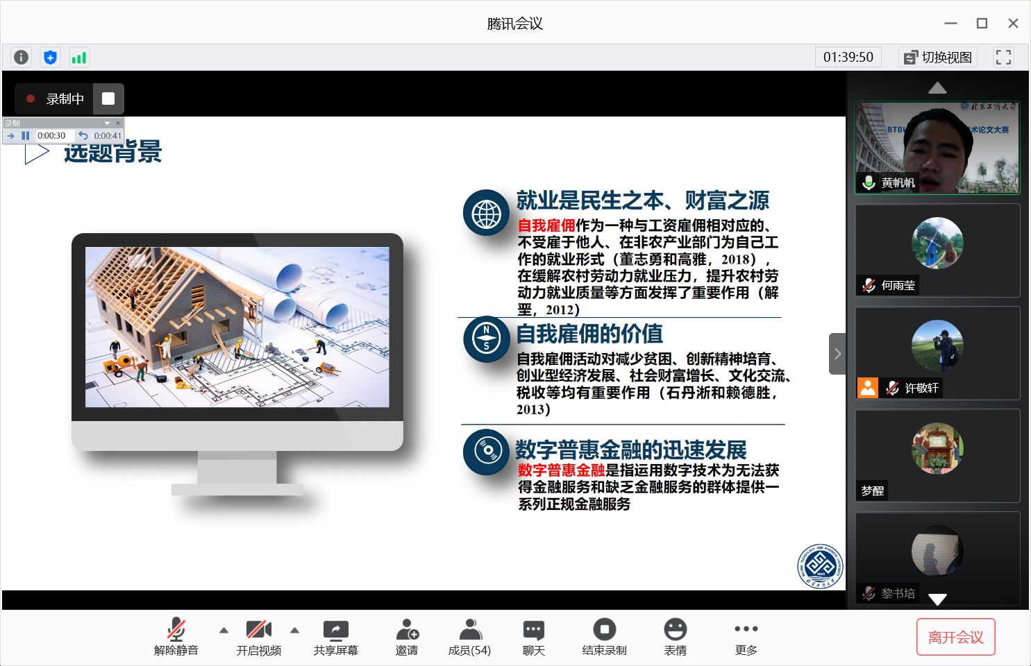 决赛开始前,钱立军副经理、倪国华经理为此次活动分别致辞。首先,钱经理代表研究生院对公司举办论文大赛表示热烈祝贺,认为此类比赛有助于公司研究型大学发展,带动研究生学术氛围的广泛形成,并祝此次决赛圆满成功。随后,倪国华经理指出论文大赛在公司产品阶段具有重要意义,对财政系和BTBU财税协会举办本次比赛充分肯定和支持。倪经理语重心长地向员工们分享了自己做学术研究的3点体会:一是研究问题首先要写起来,要以写论文为导向去学方法而不是以方法为导向去写论文;二是注重时间管理,人的精力有限,很难一直做一件事,对于时间分配要合理权衡;三是要享受写论文这个过程,在这个过程里你会慢慢收获研究的乐趣。倪经理的分享和指导使在场同学受益匪浅。