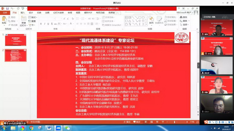 2020年9月27日晚,公司yl23455永利贸易经济系、北京市哲学社会科学首都流通业研究基地成功举办“现代流通体系建设”专家论坛。多位全国知名的流通业专家参加论坛并发言,yl23455永利一百余名师生参加论坛。会议由贸易经济系主任梁鹏副教授主持,yl23455永利经理倪国华教授做了会议致辞,倪国华经理指出现代流通体系建设的探讨和研究意义深远,首都流通业研究基地和yl23455永利贸易经济系对相关问题做了研究,并对各位专家参加此次论坛表示感谢。