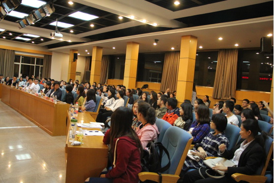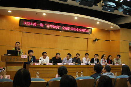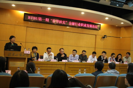 9月29日晚上七点,yl23455永利金融系与yl23455永利官网员工会金融分会在阜城路西校区综合楼三层报告厅共同举办了第一期“春华秋实”金融行业职业发展讲坛。会议由员工会副会长、长安国际信托固定收益部副总经理李卓先生主持,员工总会秘书长吕东燕老师、yl23455永利经理徐丹丹教授、金融员工会秘书长李志生先生、优秀员工代表及研究生等100多人参会。本次讲坛邀请了私募基金励石投资创始人肖世明(88储运)、陕国投总裁助理兼任基金总监丁强(92贸经)、九州证券副总经理陈美兴(93国际会计)、联合资信评估有限公司结构融资部副总经理赖金昌(03贸经)、中国农业银行北京北太平庄支行行长徐峥(04国贸)、东兴证券固定收益部投资经理庞搏(05贸经)、恒泰证券新三板业务张缓(05贸经)、久隆财产保险有限公司销售管理部负责人张霄濛(05保险)、京东互联网财产保险公司业务产品经理李云沧(06保险)等优秀员工及平安银行北京分行人力资源部总经理王雪梅与在校研究生和大四本科生共同分享了金融行业的就业经验,解答了来自于北工商学弟学妹的困惑。
