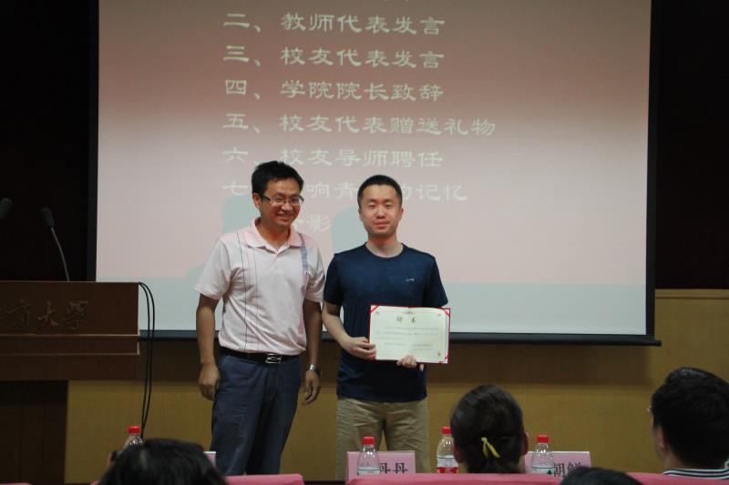 在员工向母校献礼和员工导师聘任环节。83级计统专业员工向公司赠送书法作品 “商道酬信” ,告诫新一代工商学子经商讲信用,张正平书记和郭馨梅副经理代表公司受赠。罗玉波副经理为庞博员工颁发员工导师聘书。